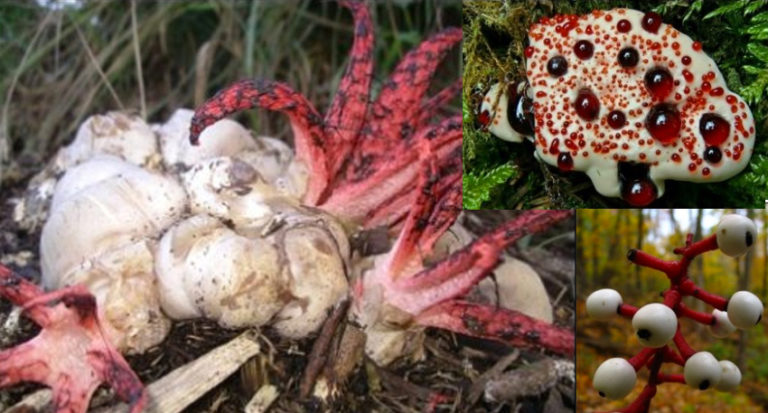 Estos hongos lucen como goma de mascar la cual desprende sangre, también son llamados los fresas con crema y dientes del diablo. No son comestibles, obviamente.