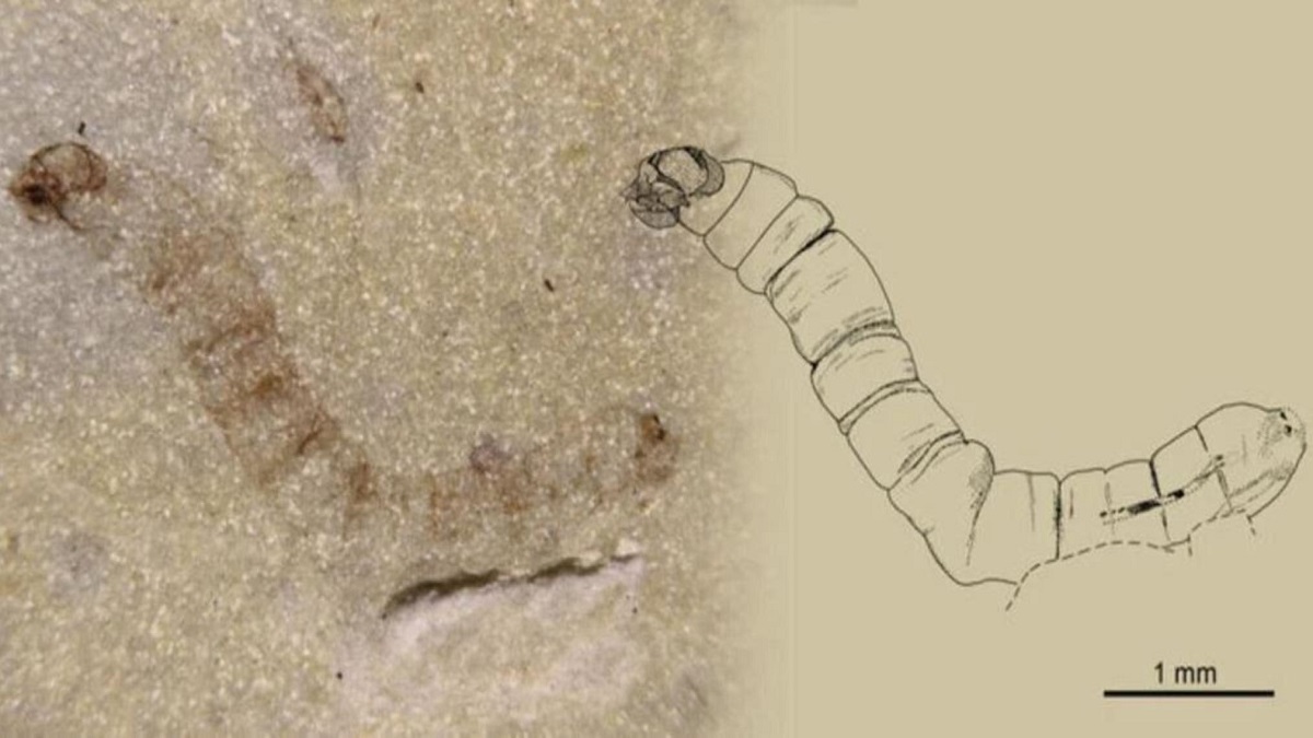 El fósil de larva bellamente conservado, solo unos pocos millones de años después de la extinción más grande del planeta, se encontró en la roca de un acantilado en la playa.