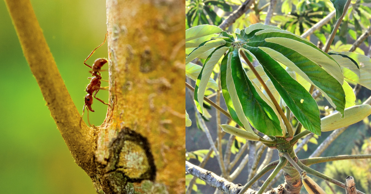 Algunas hormigas y plantas han logrado desarrollar relaciones simbióticas, en las que las hormigas pueden proteger a su planta huésped contra las amenazas, mientras que la planta hospedadora les otorga alimento y refugio a cambio.