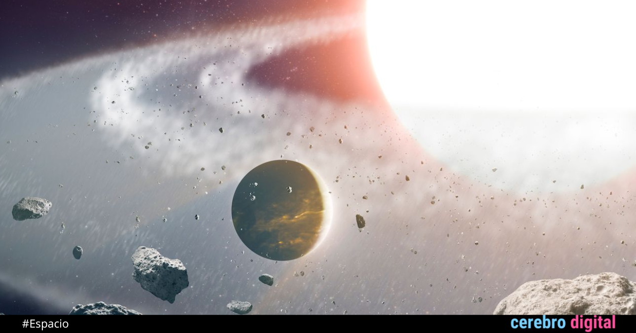 Una ilustración del planeta 8 Ursae Minoris b, apodado «Halla», en medio de un entorno de fragmentos resultantes de la colisión violenta de dos estrellas. La supervivencia del planeta tras la fusión es posible, aunque también existe la posibilidad de que sea un nuevo mundo creado a partir de los restos estelares. Créditos: Observatorio WM Keck & Adam Makarenko.