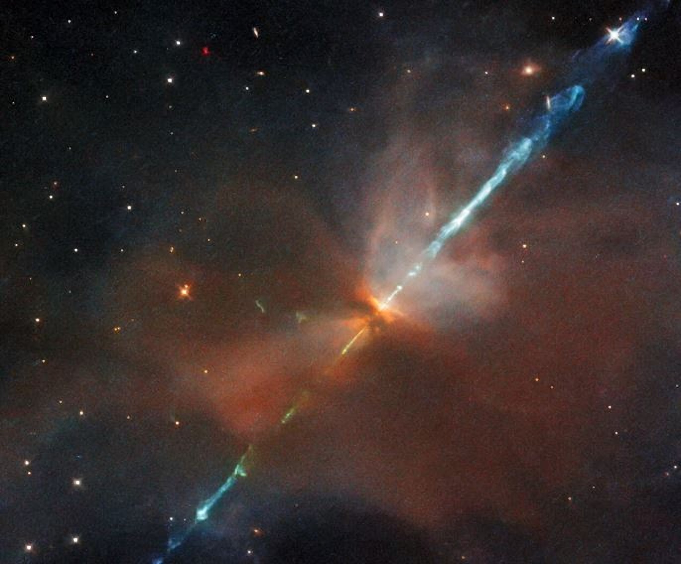 Los objetos Herbig-Haro es donde nacen las estrellas en medio de nebulosas estelares con nubes de gas y polvo. Las nubes se condensan en una protoestrella cada vez mas activa, una cantidad del material estelar escapa al espacio en forma de chorro que recorre cientos de kilómetros por segundo. El gas está a tan altas temperaturas que los electrones se desprenden de los átomos formando una corriente supercargada.