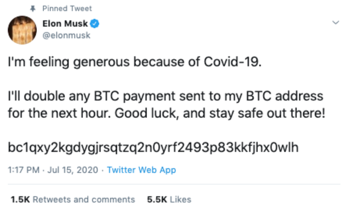 Todo dió inicio con la cuenta de Twitter de Elon Musk, cuando apareció un mensaje del pirata informático para ejecutar una estafa de bitcoin, “Me siento generoso por Covid-19. Duplicaré cualquier pago BTC enviado a mi dirección BTC durante la próxima hora. ¡Buena suerte y mantente a salvo allí!» seguido de la dirección de bitcoin.