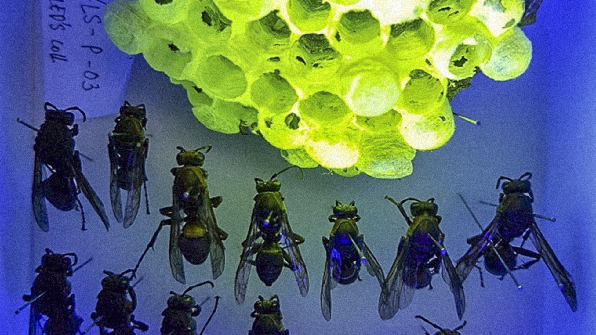 Científicos descubrieron nidos de avispas que brillan de color verde fluorescente bajo la luz ultravioleta.