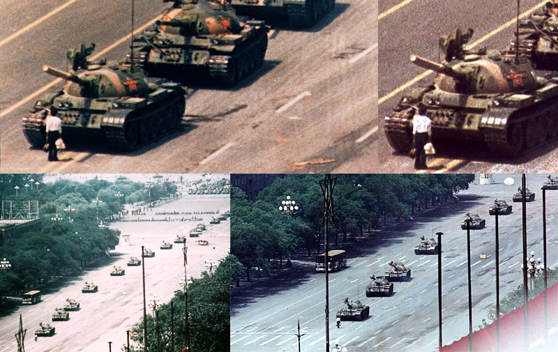 Mientras los tanques se le aproximaban, el hombre se mantuvo solo y en pie, sosteniendo dos bolsas similares, una en cada mano. Mientras los tanques iban disminuyendo la marcha, él hacía gestos para que se fueran. En respuesta, el tanque situado en cabeza de la columna intentó sortearlo, pero el hombre se interpuso repetidamente en su camino, demostrando una tenacidad y resistencia enormes. Tras esto los tanques se detuvieron y el individuo subió encima del primer tanque, y sostuvo una conversación con el conductor. Hay especulaciones sobre lo que dijo, adjudicándosele frases como “¿Por qué están aquí? Mi ciudad es un caos por su culpa”; “Retrocedan, den la vuelta y dejen de matar a mi gente”; o “Váyanse”. Luego, la grabación muestra cómo varios civiles empujaron al hombre entre la multitud, mientras los tanques seguían su camino. Muchos sospechan que eran, en realidad, fuerzas de la ley sin uniforme o personas que no querían que la situación llegara a otro nivel.