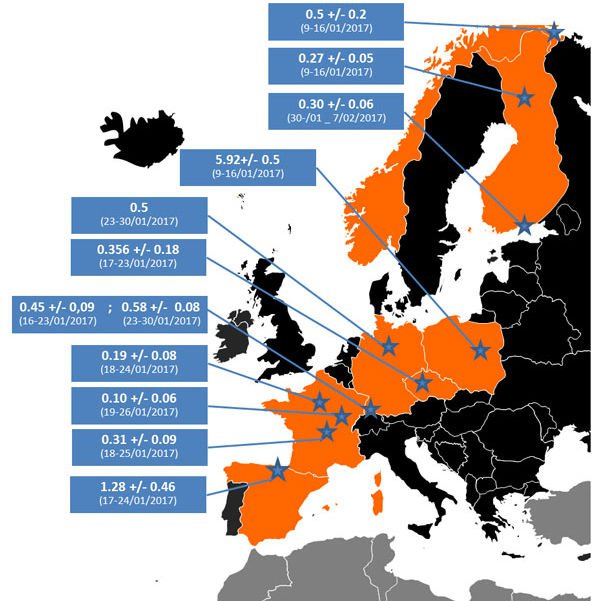 Mientras que el apogeo de la radiación ocurrió en Enero, los oficiales de Finlandia y Francia han hecho la información pública este mes, añadiendo que luego de la aparición en Noruega, fue detectada en Polonia, Finlandia, Alemania, Francia, Republica Checa y España, hasta el final de enero.