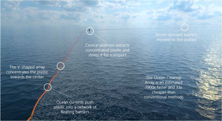 La barrera en forma de V, recogerá los residuos en un punto central donde pueden ser recogidos para su reciclaje.