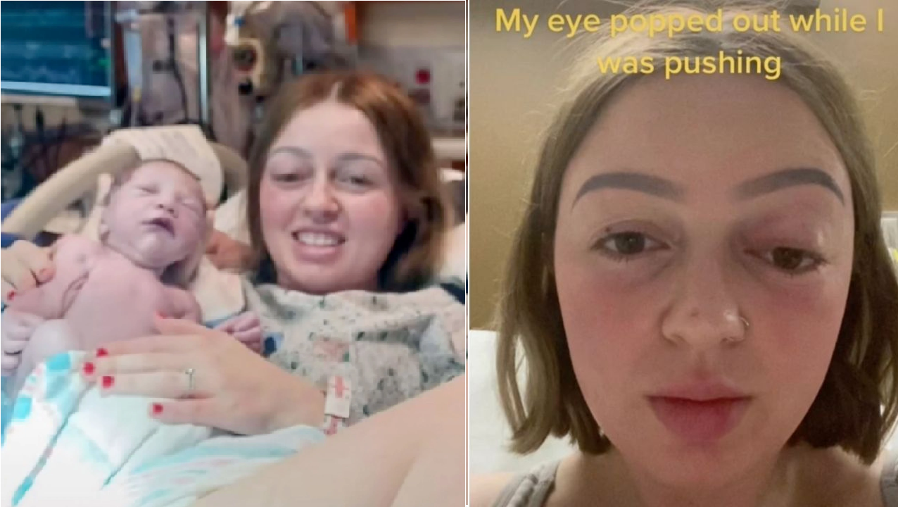 Bethany Collins, de 23 años, les dijo a sus seguidores que presionó tanto durante el trabajo de parto que uno de sus ojos en realidad «se salió», pero dijo que volvió a la normalidad seis semanas después.