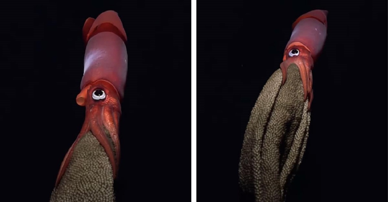 En una extraordinaria muestra de comportamiento captada por el Instituto Oceánico Schmidt, un calamar de ojos negros (Gonatus onyx) fue filmado nadando por el océano frente a la costa de Costa Rica mientras llevaba casi 3 000 huevos en sus brazos.